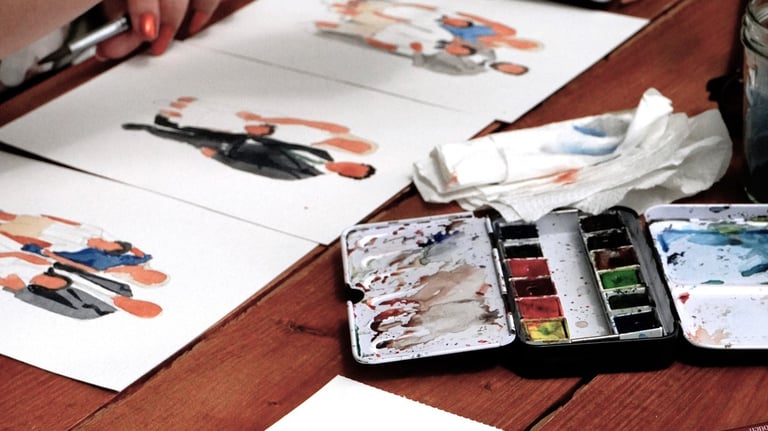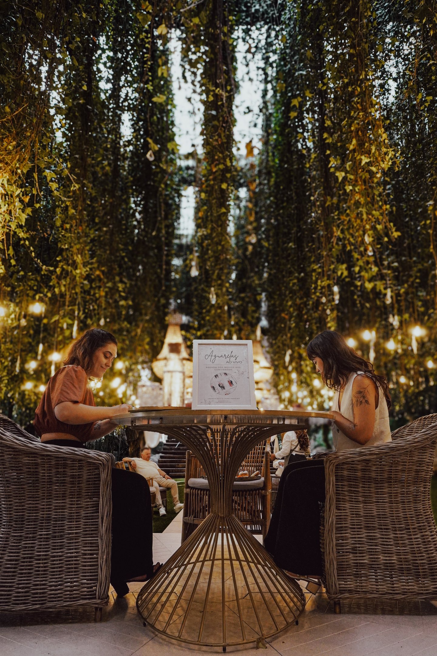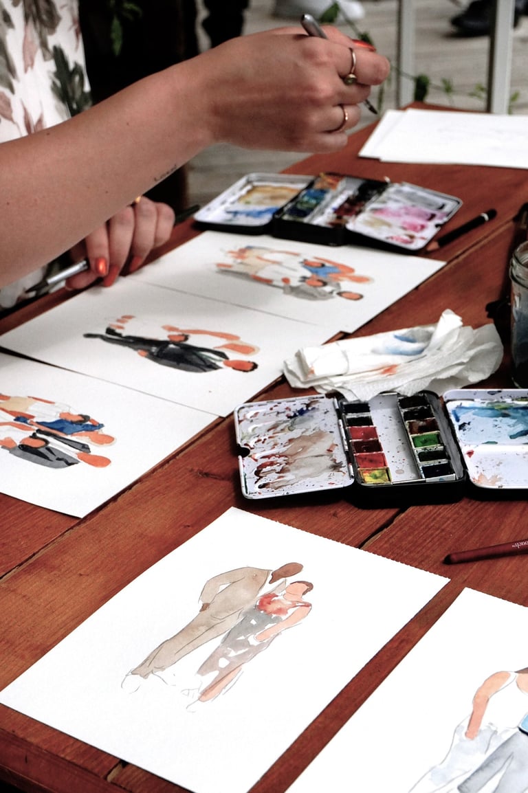 As aguarelistas iniciam simultaneamente as pinturas, capturando a essência e os detalhes de cada convidado com agilidade e precisão.