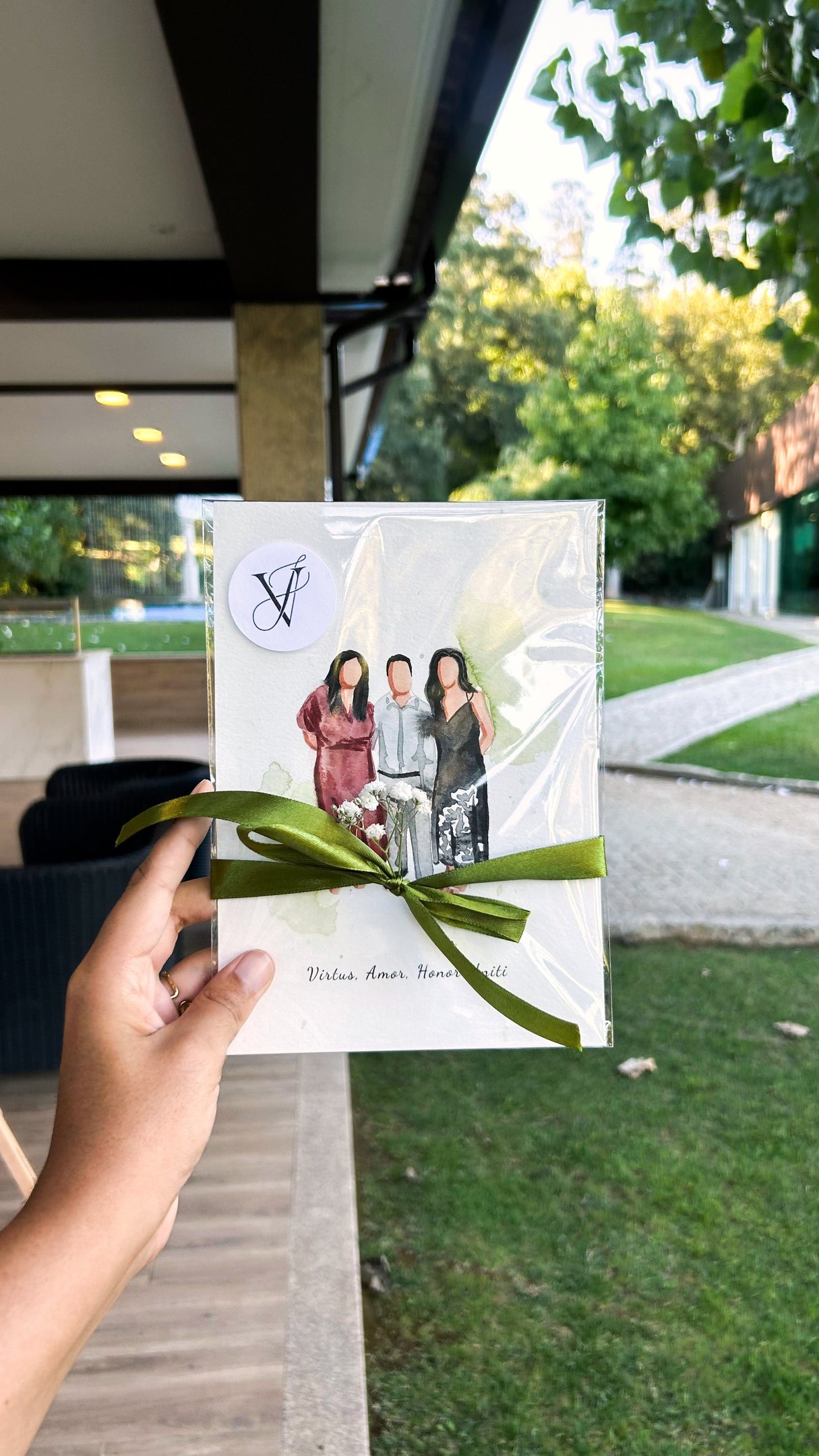 Cada família tem sua foto tirada pela nossa equipa, garantindo a referência para uma ilustração fiel.