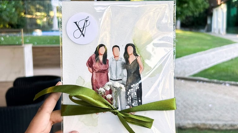 Ilustramos até 4 pessoas por pintura, garantindo equilíbrio na composição.