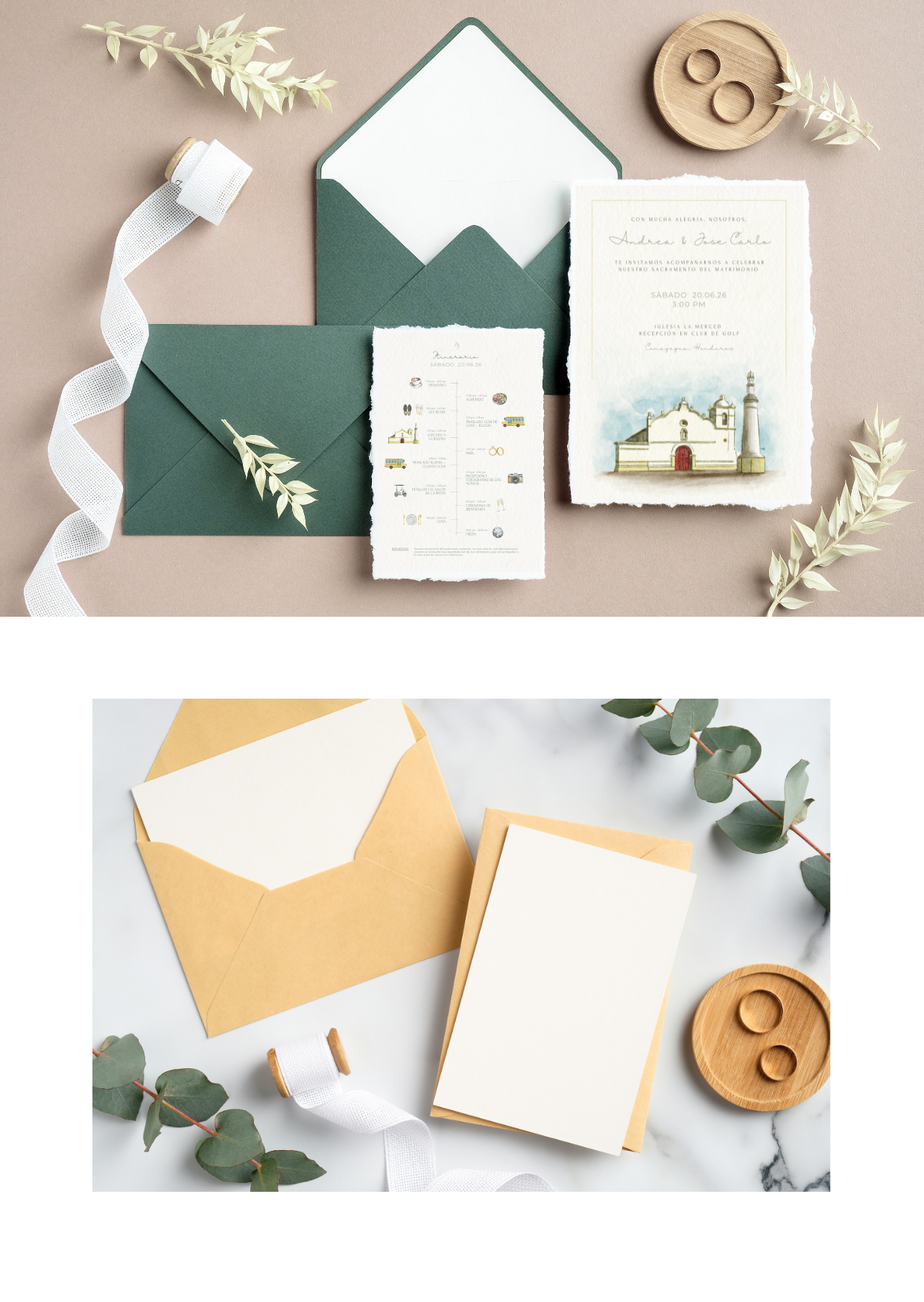 Também criamos ilustrações personalizadas para convites de casamento, incluindo aquarelas e elementos artísticos que tornam cada projeto único. Essas ilustrações podem representar o local da cerimónia, elementos botânicos ou outros detalhes especiais da história do casal.